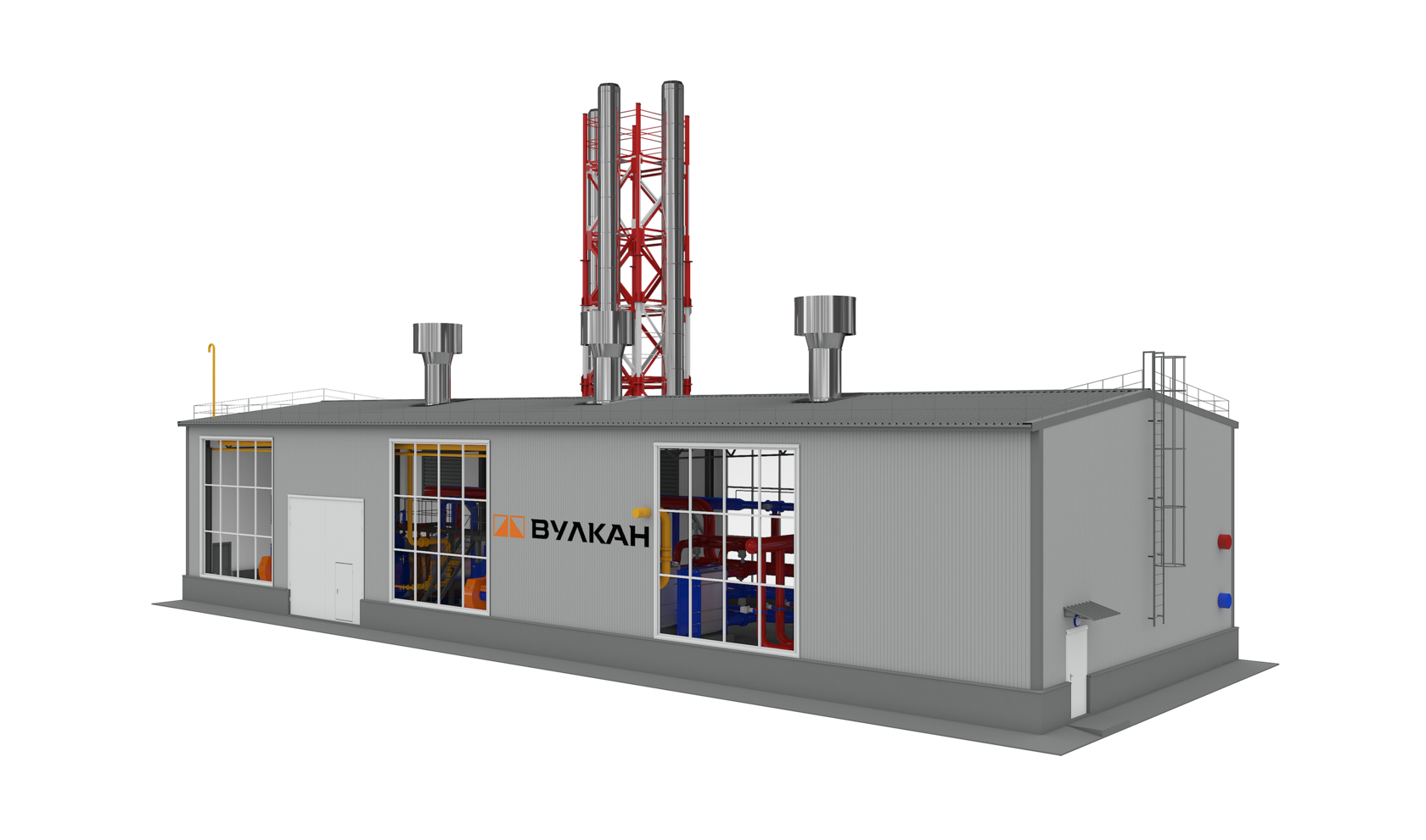 Котельная реализована с закрытым контуром через пластинчатые теплообменники. Основной вид топлива газ, резервное - дизельное топливо. Котельная была выполнена в транспортных габаритах.