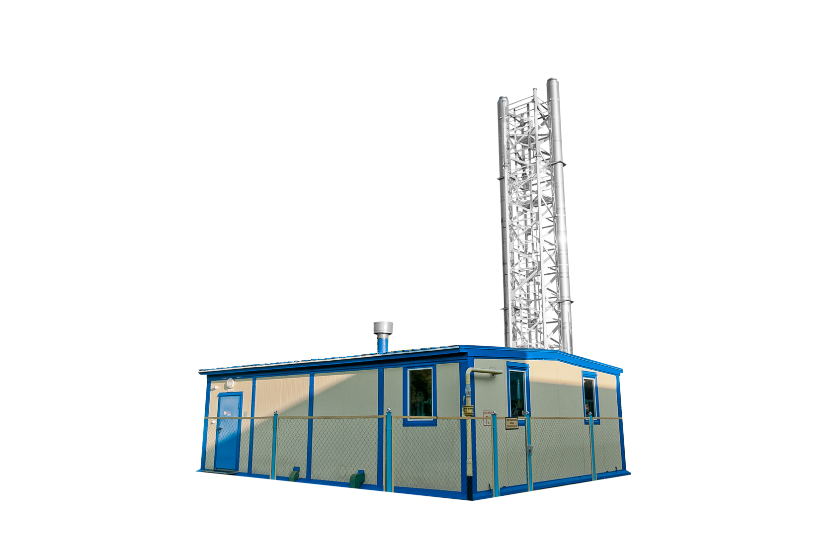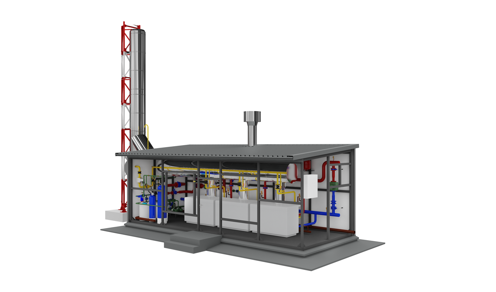 Котельная реализована с закрытым контуром через пластинчатые теплообменники. Основной вид топлива газ, резервное - дизельное топливо. Котельная была выполнена в транспортных габаритах.